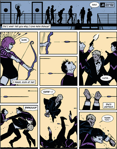 This David Aja page from 2012’s Hawkeye #2 provides a good example of art that, to it’s credit, could never quite be adapted into any other medium.