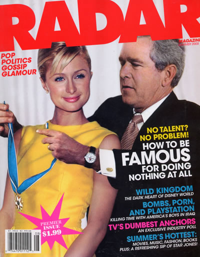 I first saw it, as the cover reminds me, in the summer of 2005. The cover has a doctored photo of George Bush lovingly placing a medal around the neck of Paris Hilton. “no talent? No problem! How to be famous for doing nothing at all.” Inside, there’s articles about a kid performer called “Zack Attack” and his insane parents, the people who portray Disney characters at Disneyland getting their freak on, the inside dope on which cable and network news anchors are morons, and maybe 20 other equally brilliant tidbits.