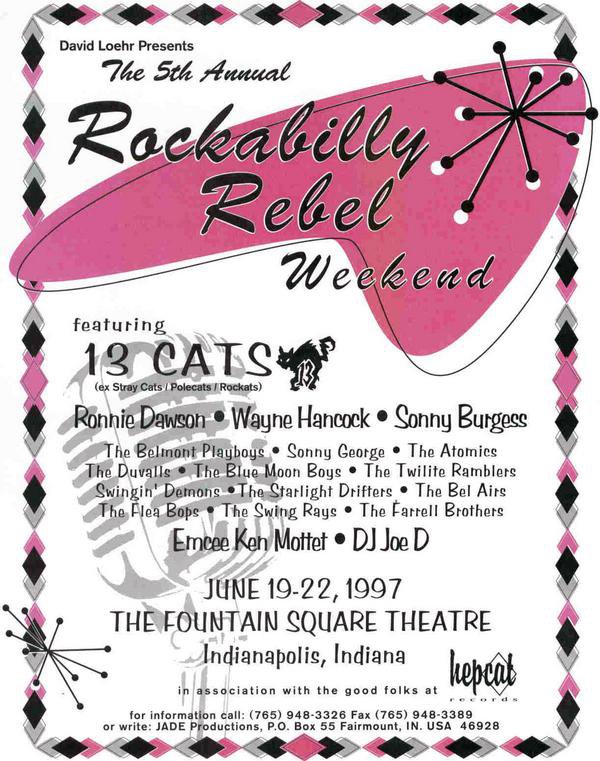It was sheer serendipitous luck that I came to find out about David Loher’s Annual Rockabilly Rebel Weekend, held in Indianapolis every summer. Three nights of bands from all over the country -the world, even- at the lovely vintage Fountain Square Theater, affectionately referred to by all in the know as “Indy.” I went to my first one in 1997, mere weeks after my High School Graduation. I never knew it, but I was a part of something. Here it was. Life changed considerably after that.